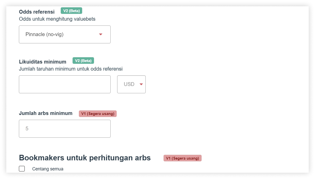 Harap diperhatikan bahwa Valuebets V1 dan V2 akan berjalan berdampingan untuk beberapa waktu, tetapi kami sangat menyarankan Anda untuk beralih ke V2, karena rencana jangka menengah kami mencakup penghentian bertahap V1.